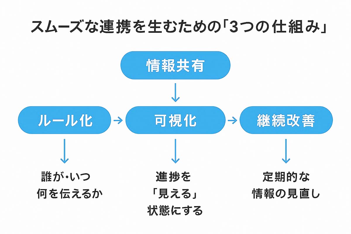 スムーズな連携とは、「人と人」「企業と企業」が同じ方向を向いて動くこと。そのためには、仕組み化・可視化・改善の3つのサイクルを回すことが大切です。