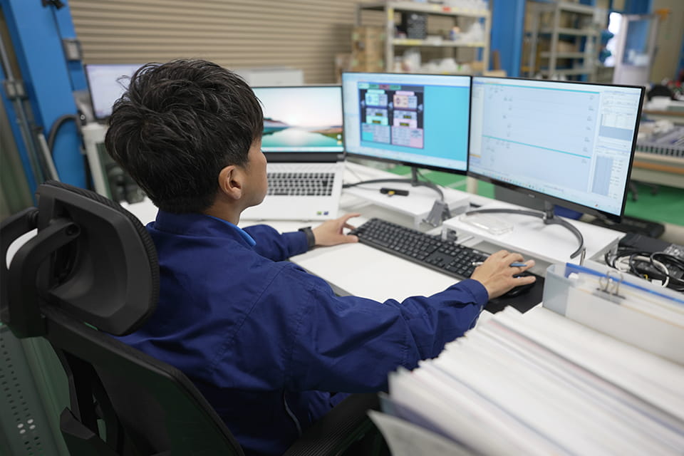 - ハード設計(制御盤設計)やソフト設計(PLCプログラムの設計、タッチパネル作成)を担当します。