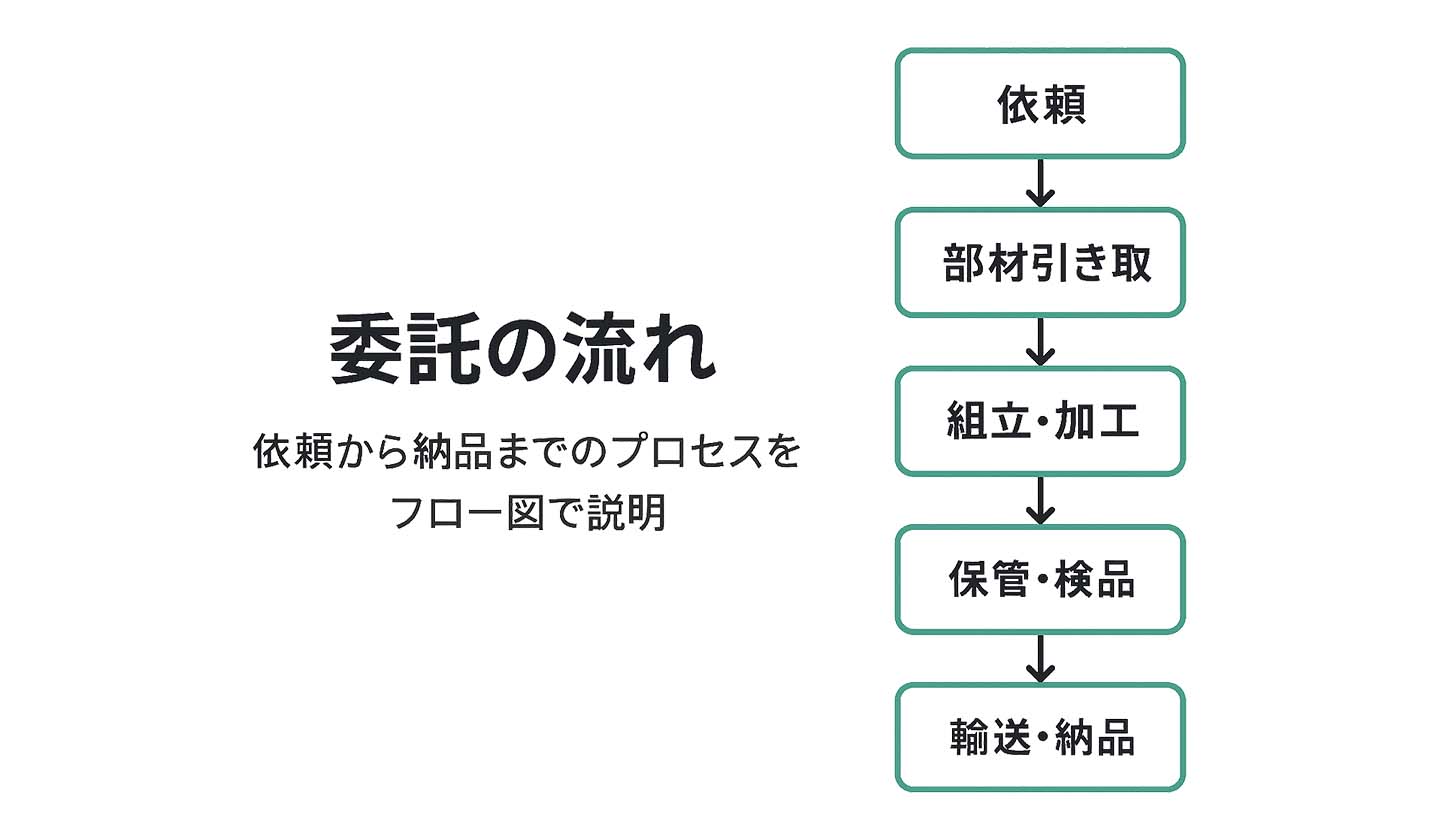 単なる「便利さ」や「コスト削減」だけではなく、メーカー様が本来注力すべき開発や営業に集中するための「未来への投資」としての価値を提供することが可能です。本記事では、実際の委託の流れをフロー図で整理し、依頼から納品までのプロセスをご紹介します。